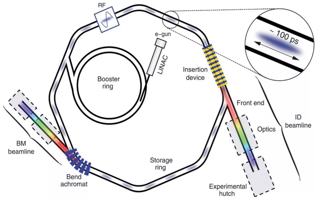 依据上述磁铁偏转电子引发电磁辐射的方式,人们建立了现代大型同步辐射光源,即:一开始电子在直线加速器中加速到MeV量级,随后进入圆形加速器中迅速提升至接近光速,之后高速的电子进入外围储存环中,最后这些电子在通过特制的插入件以释放出一定的同步光。这也就是为什么上面显示的不同地方的同步辐射都是UFO形的。为了最大化该装置的利用,人们在储存环的不同部位通过插入不同类型的磁铁以获得不同特性的同步光,进而服务于不同的实验对象。