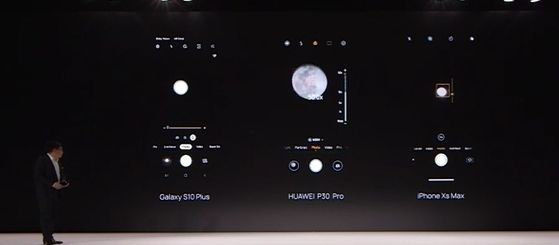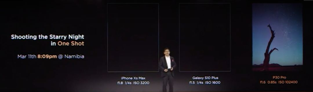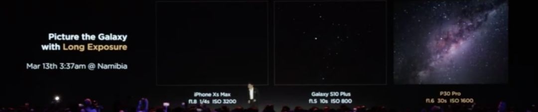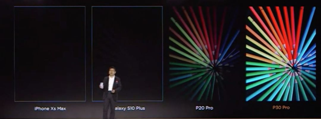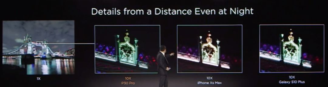 在暗光拍摄情况下,余承东先生展示了一系列P30 pro与iPhone XS Max与三星Galaxy S10 Plus所拍的照片对比图,结果你懂的,吊打友商。