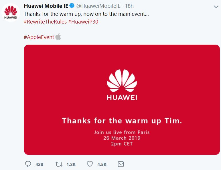 于是,硬件翻新的重任就落到了大洋彼岸的华为身上。华为也的确不负众望,连夜发推文“皮“了一下,表示:感谢苹果CEO蒂姆的暖场。并向网友们喊话“现在该去真正的压轴活动了”。