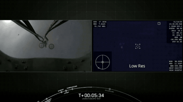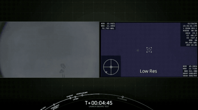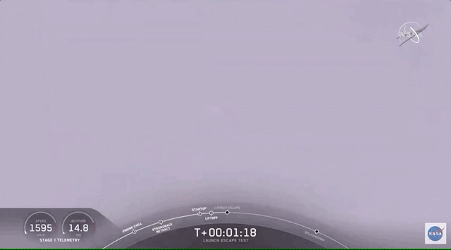 1分钟24秒左右,火箭速度超过1600公里/小时,引擎熄火,太空舱上的八个推进器同时点火,并达到最大推力,太空舱弹射而出。