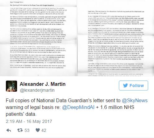 Sky News 周一获得并公开了由 NDG 寄给皇家自由NHS信托和 DeepMind 联合创始人 Mustafa Suleyman 的信件。一位 NDG 发言人证实了该信件的真实性。