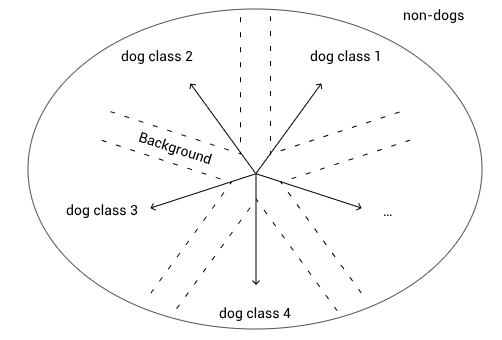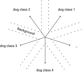 从我的经验来看,第二种方法表现不佳。我发现这样的模型学会了以狗狗为中心进行嵌入(logit层和softmax之前的最后一层),并且阈值通常会将各种类别的边界附近的嵌入映射到“背景”一类中: