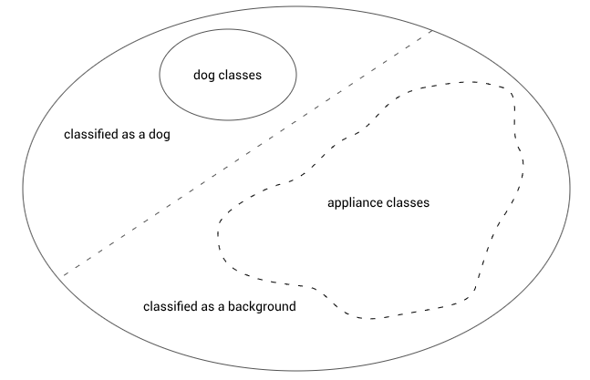 这样的分类器在没有狗狗的图像上可以任意工作。接下来,我们会介绍只能预测背景概率的分类器。