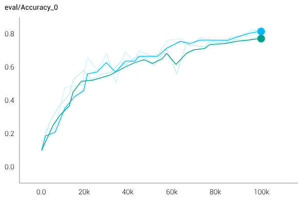 没有学习背景特征的模型在大多数训练中都保持领先,在没有训练背景的情况下,精确度在15个类别的数据集上都有了提升(9种狗狗类别、6种电器类别和其中的背景类别),同时在有1000种数据集分类上也有进步(9个狗狗类别、991种电器类别和其中一个背景类别):