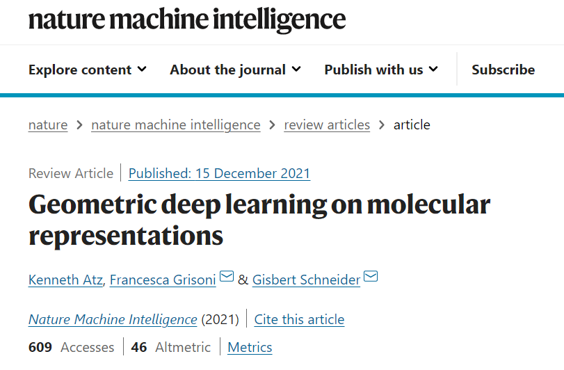 本文介绍由瑞士苏黎世联邦理工学院化学与应用生物科学系的Francesca Grisoni和Gisbert Schneider共同通讯发表在 Nature Machine Intelligence的研究成果:本文作者重点介绍了几何深度学习在药物发现、化学合成预测和量子化学等领域的应用,其包含几何深度学习的原理和相关的分子表征,例如分子图、网格、表面和字符串。作者讨论了分子科学中几何深度学习面临的挑战,并展望其未来应用。