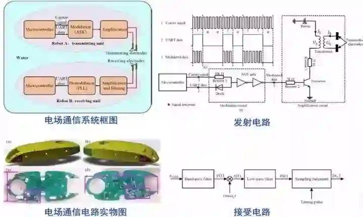 我们能不能赋予机器鱼这个功能呢?所以我们也给机器鱼设计了产生电场的电路。我们开始建立模型并进行理论分析,设计相应的电路系统,给仿生鱼安装发射电极和接收电极,最终成功实现了仿生机器鱼的新水下通信方式。