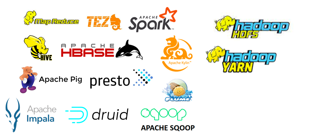 在这三个组件中,发展最迅速和多元的是计算组件这一层,最早只有一个 MapReduce,但业界很快在计算层上面各显神通,造出了一大堆的轮子,包括有 MapReduce,Tez,Spark 这样的计算框架,Hive 这类数据仓库,还有 Presto、Impala 查询引擎,各种各样的组件。配合这些组件的,还有像 scoop 这样的数据流转采集的组件也很丰富,一共有几十款。
