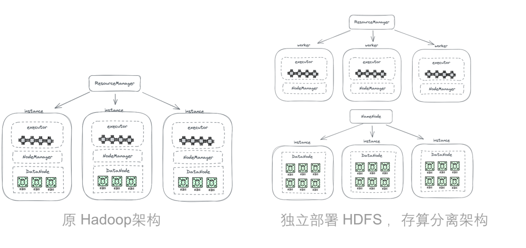 Hadoop 的诞生改变了企业对数据的存储、处理和分析的过程,加速了大数据的发展,受到广泛的应用,给整个行业带来了变革意义的改变;随着云计算时代的到来, 存算分离的架构受到青睐,企业开开始对 Hadoop 的架构进行改造。