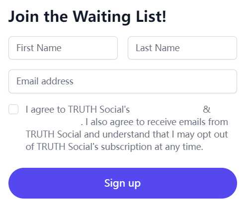 在「真实社交」官网,注册账号页面文字为「加入等待名单」