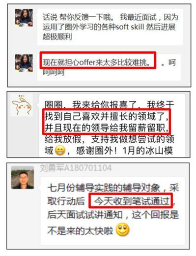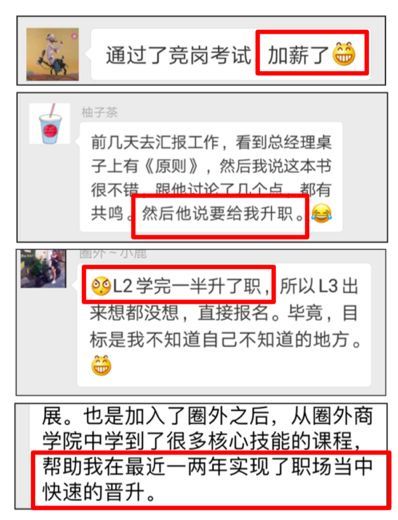 很多学员通过圈外的课程提升了职场核心竞争力:有人升职加薪,有人转型换行,有人成为斜杠青年找到了自己热爱的事业。还有学员因为对圈外的信任,把自己“投资”给圈外,成为了公司的正式员工。