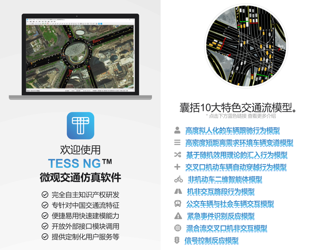 TESS NG:同济大学孙剑教授课题组于 2006 年开始针对中国混合交通流运行特征开展了 100 多项模型创新和仿真系统应用实践[22],历经十数年开发的国产微观交通仿真软件,Windows 平台,适应中国高密度、多冲突的交通流环境,模型较完备[23],可信度较高[24],开放外部接口模块调用并提供定制化用户服务。