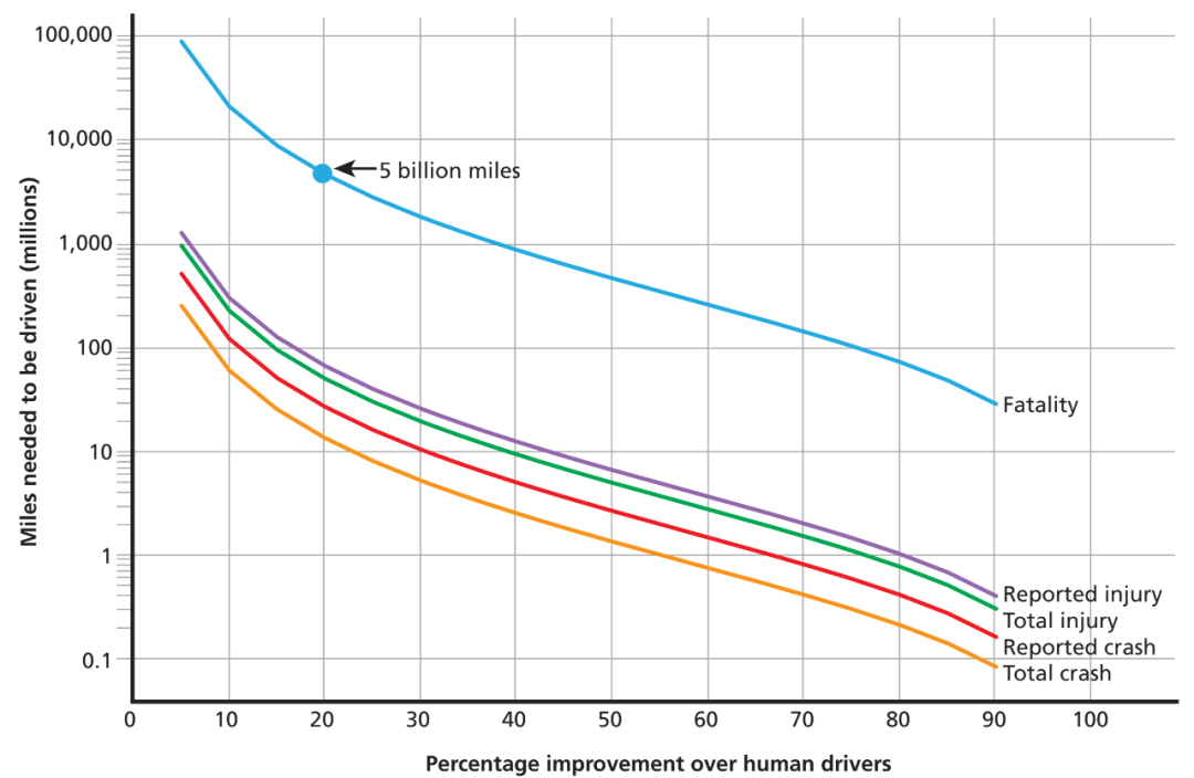 著名战略咨询公司兰德就无人驾驶的安全可靠性及所需路测里程进行了统计分析[3],其分析报告显示,在 95% 的置信度下,无人驾驶系统需要进行约 50 亿英里的路测才可证明其事故率显著小于人类驾驶员,也就是 100 辆车在全天 24 小时、全年 365 天及平均车速为 25 英里每小时的情况下,需要测试约 225 年!