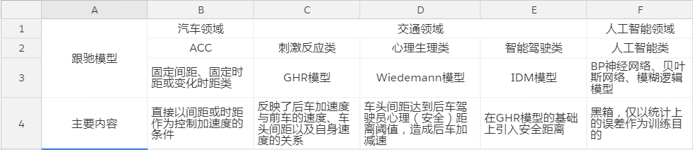 按照现有的分类方式,跟驰模型分为交通工程学和心理生理学两大类,或者是交通工程和统计物理两大类,虽然分类方法有所差异,但是所指的模型均为过去六十多年跟驰行为建模研究中的典型模型[13]。其中主要包括汽车领域中实际应用的 ACC 中的模型,交通领域中的刺激反应类、心理生理类模型以及人工智能类模型等,如下表所示: