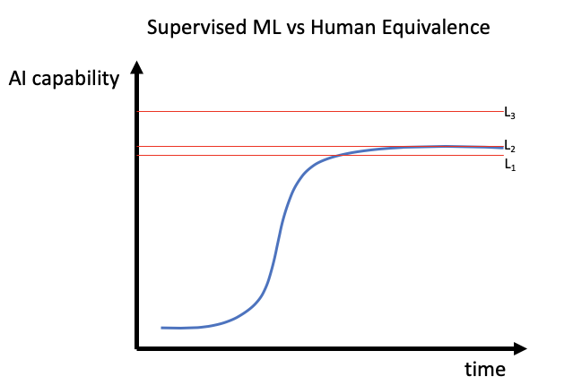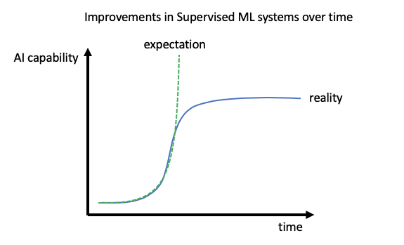 众所周知,构建 AI 无人驾驶方案的最大挑战,在于处理各类不太常见的情况,也就是所谓极端条件。实际上,模型本身的质量越高,寻找全新极端案例数据集的难度就越大。另外,模型质量越高,改进所需的数据就得越准确。因此,人们意识到 AI 性能质量并不能保持指数级增长(即摩尔定律),反倒是 AI 系统的改进成本在呈指数级增长。从这个角度出发,有监督机器学习似乎必然不可持续(下图中的 S 形曲线)。