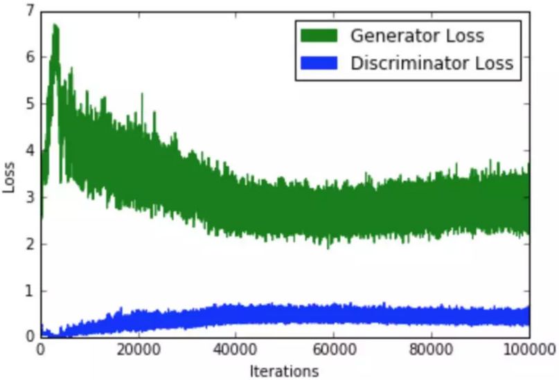 GAN 训练过程中遇到的一个问题是什么时候停止训练?因为判别网络 D 损失降级会改善生成网络 G 的损失(反之亦然),因此无法根据损失函数的值来判断收敛,如下图所示: