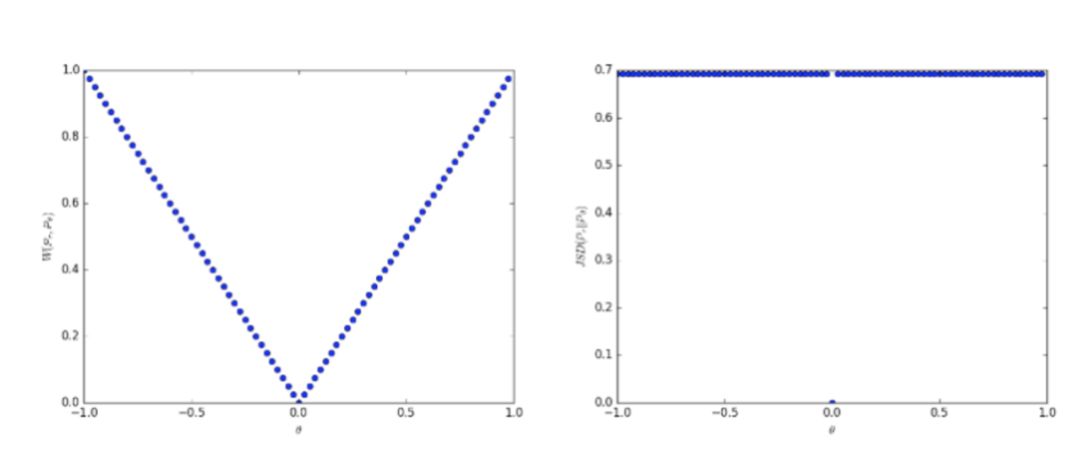 左图中 earth mover distance 是连续的, 即便其分布并不连续, 这不同于优图中的 the Jensen Shannon divergence。