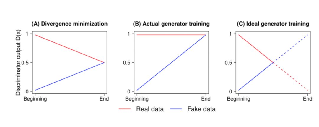 图 A 表示 JS 散度的最优解,图 B 表示使用标准 GAN 损失时判别网络 D 的输出,图 C 表示输出曲线的实际图。