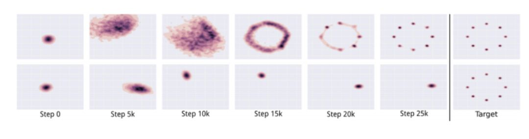 注:Mode collapse 是指 GAN 生成的样本单一,其认为满足某一分布的结果为 true,其他为 False,导致以上结果。