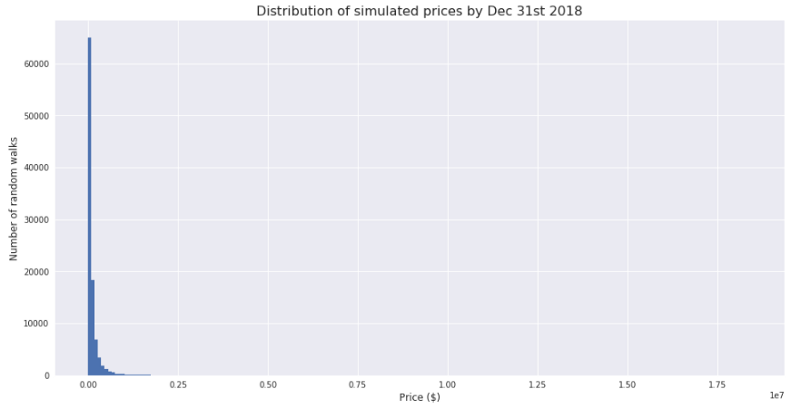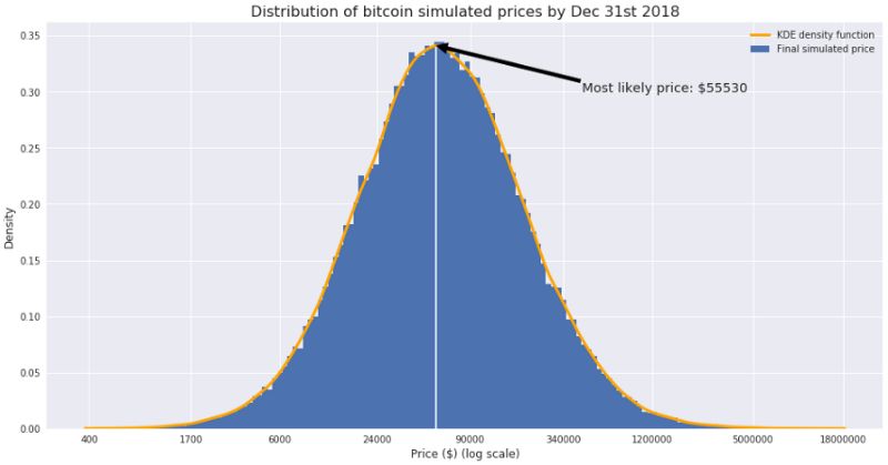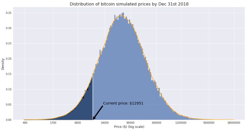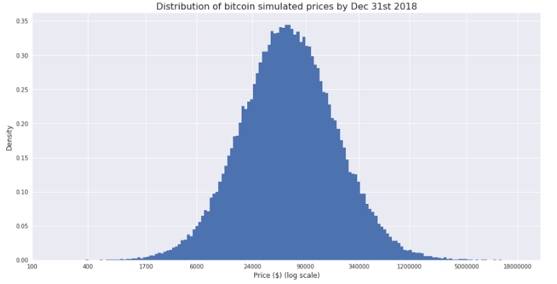 为了在模拟过程中构建每一个随机游走,我们对2010年至今的每日收益数据进行随机抽样,对每个样本加上1,并且累积到2018年12月31日。然后,将当前比特币的价格乘以随机游走的价值来获得模拟的比特币未来价格。这样会重复做很多次(在这种情况下是10万次),到今年年底,我们将看到每个随机游走的最终价格分布。