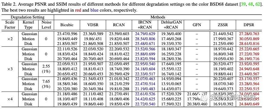 在BSD68数据集上,使用常用的PSNR和SSIM图像质量评价方法,DPSR取得了毫无争议的最好结果。如下图所示: