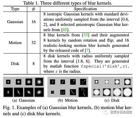 作者们研究了如下模糊核,包括高斯模糊、运动模糊、Disk模糊。