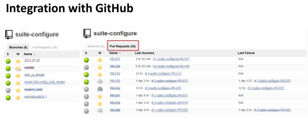 当你 Pull Request 提交过来后会自动扫描帮你创建出 Jenkins 的 Pull Request 的 job,如果关闭会在 job 上打一个横线,这个 job 就会自动的销毁了。这个是节省了很多配置 Jenkins job 上面人力的成本,全都可以自动的做出来。