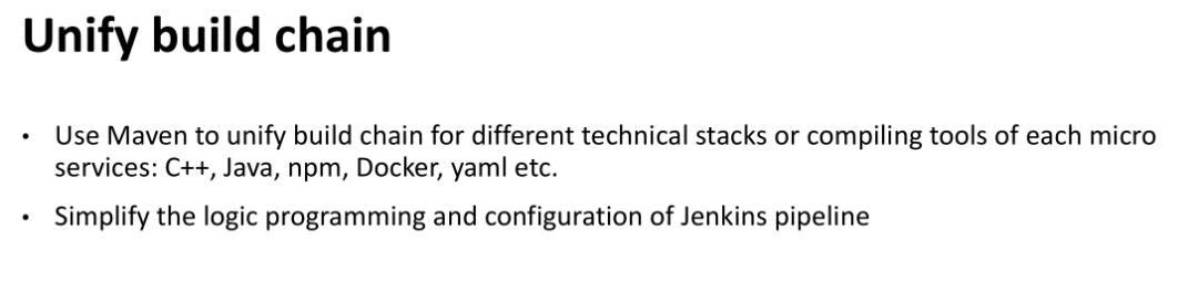 统一我们的 build chain。既然我们是微服务的团队,每个服务之间采用的技术栈,差异是非常大的。尤其是像 go 语言这种,编译打包的方式各不相同。我们每个项目都是用 Jenkins file 方式来做流水线的。