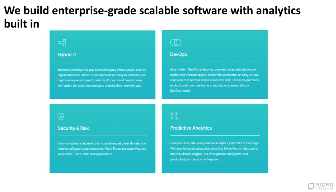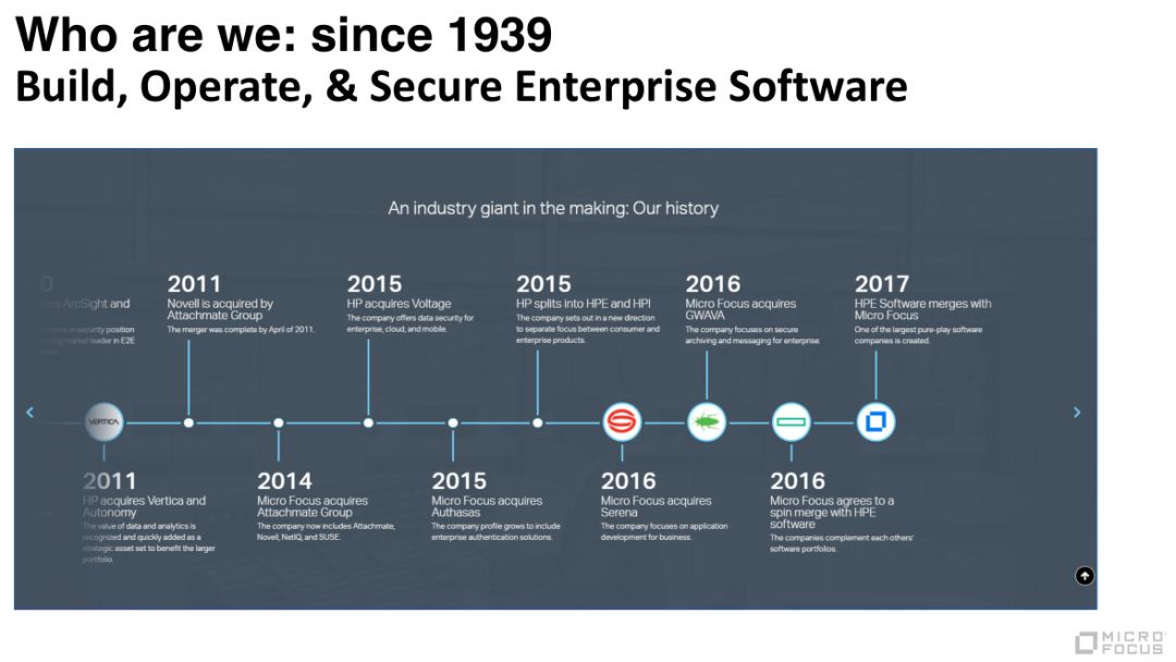 开始之前我先简要介绍一下我们是谁,我们是干什么的。Micro Focus大家会比较陌生,但惠普大家都听说过。不久前2017年9月1日,原先惠普的软件业务跟来自于英国的 Micro Focus 公司进行了合并,于是江湖上就诞生了一家新的公司。