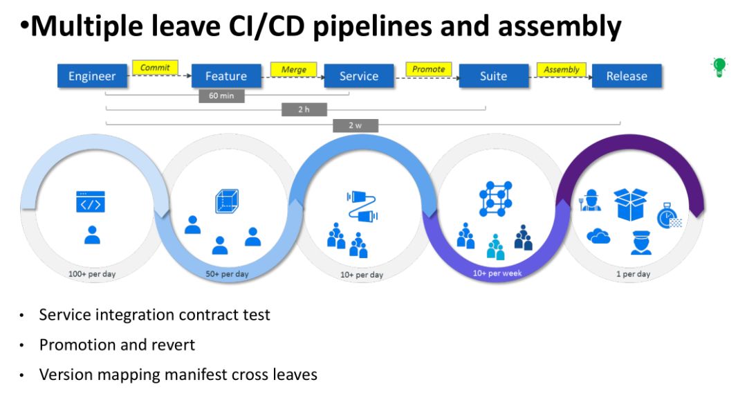 当他跑完这个闭环以后,会向上一个级别 promote 自己的一个版本,就进入一个新的大周期新一轮 CI/CD 标准的循环。例如:假设一个工程师提交了一行代码,那么就会至少经过组件级别、 Service 级别以及 Suite 集成级别,至少有三层 CI/CD 的循环,最终会进入 Release 的队列。