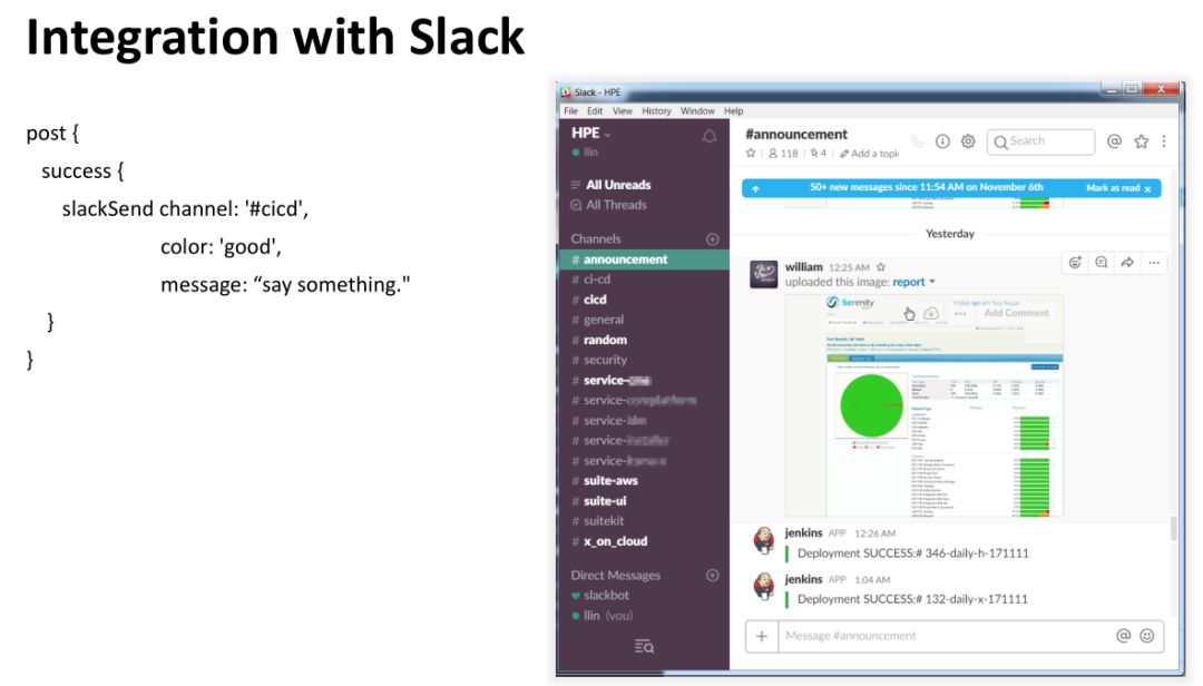 像一些部署的消息,我们测试的报告,我们都会发到这个系统里面。更重要的是他是 ChatOps 界面、接口的工具。你想让这个工具做一些事情,对话框里面打一些关键字,Slack 收到消息以后,就会去跟你想操作的系统讲话。非常好,在手机上也可以操作。