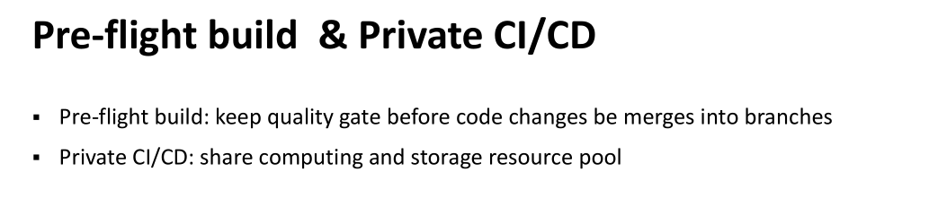 接下来是 pre-flight build 和 private CI/CD 的概念。第一个是在任何变更合入分支之前,跑一套 CI/CD 保证质量的。第二个是我们 CI/CD 不仅仅只有官方系统可以跑,任何一个工程师可以对自己私人的代码修改完成持续集成的。