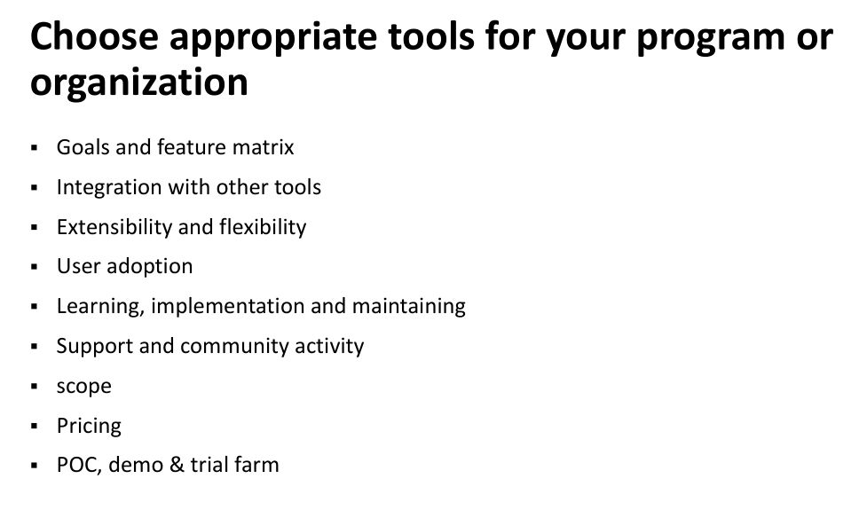 第九,考虑所有因素以后最重要的是要做 POC ,要做工具之间 demo 的对比,以及在一些小范围的项目做试点。因为只有经过项目运作检验以后,才能够证明这个工具是适合我们的,其实我们在做的时候,有时候确实会推翻,会觉得发现有一些 issue 是没有办法解决的。