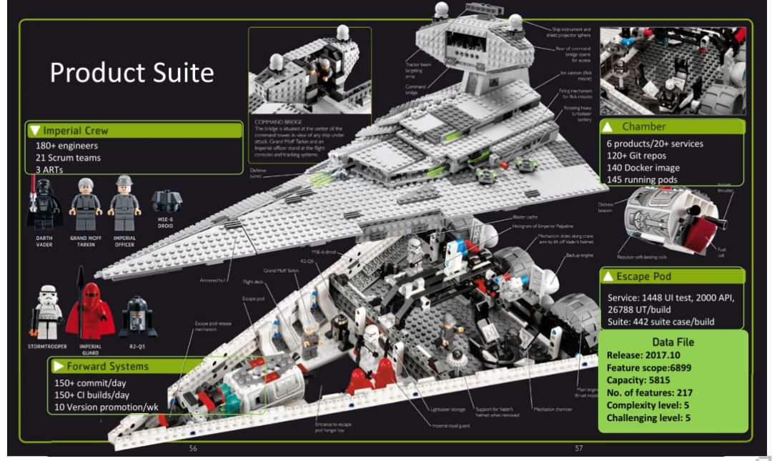 我们以这个项目 C为一个例子,打个比方,我们干的事情是什么呢?好比说我们在用乐高积木搭一艘军舰,要一块一块的快速组装起来。我们舰队的成员大概有180多个工程师,有21个时光团队。我们的弹药库是6个大的产品,从逻辑业务上切分成了20多个 service ,每个 service 向下还可以切出很多组件和技术角度的 service 。我们 Git 仓库有120多个,发布给客户的东西有140多个Docker image ,在 Kubernetes 里面部署起来有145个 pod 。