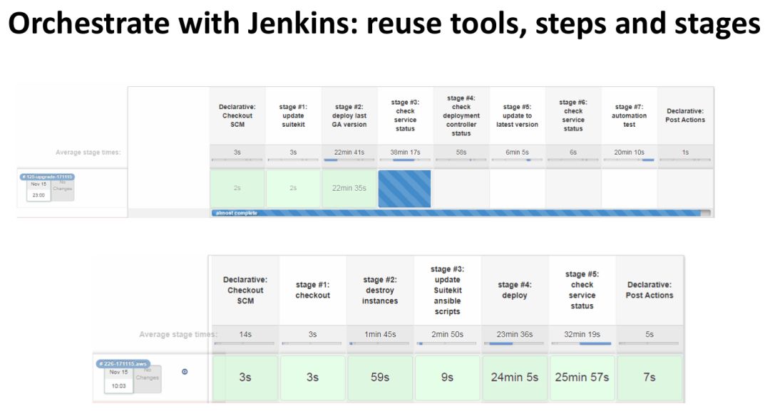 有了这些独立强大的安装部署工具以后,我们怎么样来把他编排起来的呢?主要是用 Jenkins Pipline 的方式。这里有很多共性的步骤可以复用的,图的上半部分是我们在实验室内部模拟了一次产品升级。