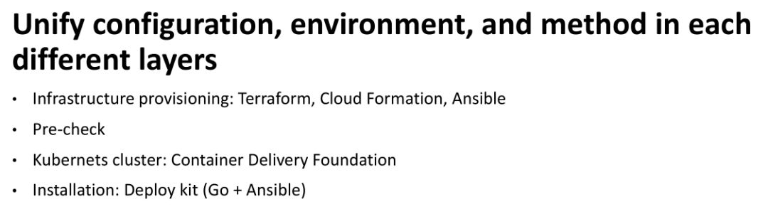 第二层我们有一个工具 Container Delivery Foundation,这件工具专门负责安装 K8s,包括多 master,多 node,各种网络和存储配置,都是用这个工具来完成的。