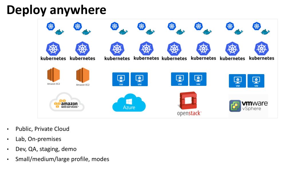 前面主要集中于持续集成,接下来我们看一下部署。我们部署的情况也是比较复杂的,公有云要支持 AWS,微软的 Azure,私有的要支持 OpenStack 和Vmware。部署在实验室或者客户环境里面都要进行部署,部署的用途有给 Dev,有给 QA,有给 Staging 环境,有给 Demo 环境。