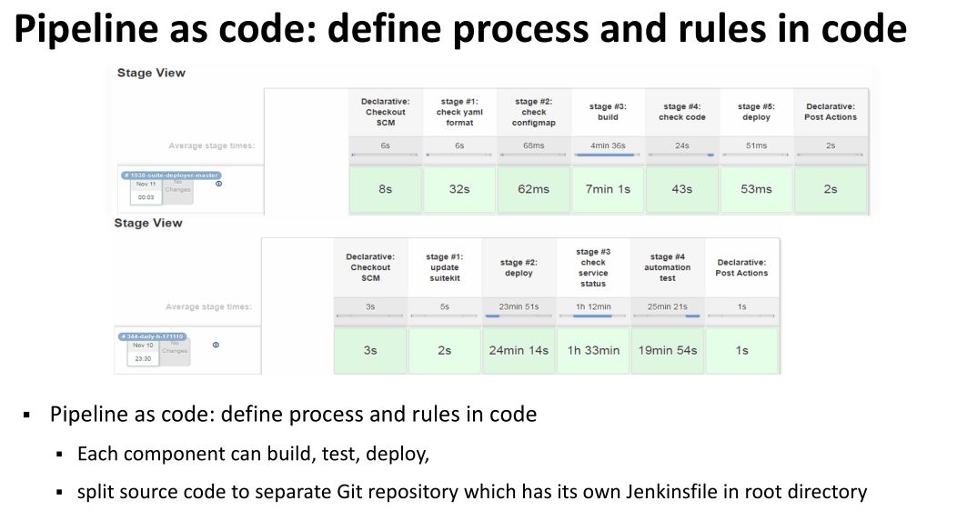 这个事情跟以前传统方式配置 Jenkins 是有一个革命性的变化,在我看来,我们每一个仓库,在它根目录下面都会有一个Jenkins file。这个文件就定义了该仓库流水线的行为,并且大家可以看到这个版本化的管理。在这件事情我认为不仅仅是流水线是代码定义,更进一步我们做的是通过代码定义了我们的流程和规则。