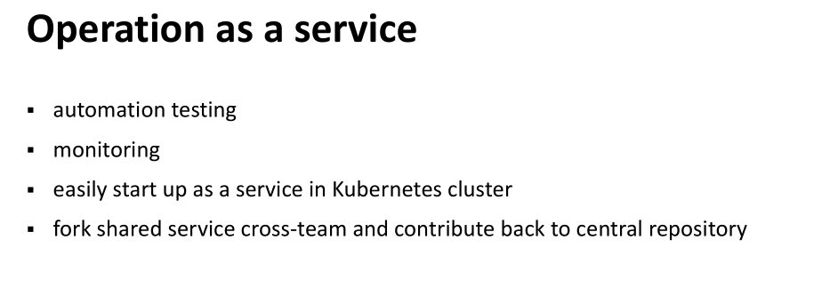 下面一个话题就是 Operation as a service 。我们把自动化测试和监控等等公共的能力作为一项服务,提供给每个不同团队。