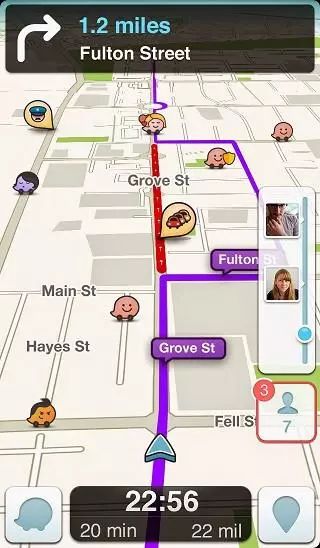 一个用户在使用 Waze,屏幕上同时显示其他用户的头像