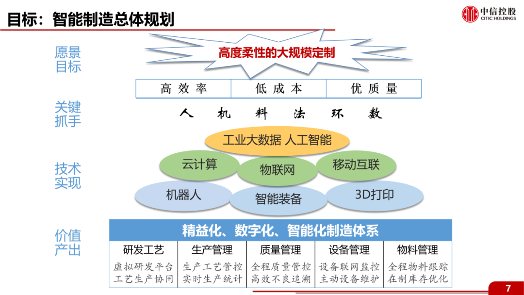 建设“高度柔性的大规模定制”汽车轻量化产品平台,是中信戴卡数智化转型的核心目标。QCD(Quality质量、Cost成本、Delivery交付)是工业生产管理的基本抓手,关键要素是人、机、料、法、环、数。在技术实现上分为三层:底层为执行层,包括机器人、数字机床、智能装备等。中间是网络层,物联网把生产装备和数据中心和决策中心连接起来,移动互联是把不同角色的人、设备和数据中心连起来,云计算、边缘计算让连接和计算无处不在,数据可能存在于中心,也可能存在于边缘端。工业大脑这一层尤其重要,正如人类的大脑,其最关键的作用包括,第一,要能存储和记忆,也就是数据管理;第二,要会学习和进步,要结合历史经验、规律规则和现实情况,来不断学习和持续改善。在价值产出上,我们希望打造一个精益化、数字化、智能化的制造体系。