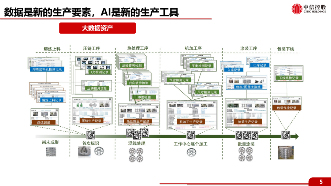 3、高度柔性的生产线:在涂装等环节实现了单件流转,以前一个涂装批次大概一千个轮子,意味着一千个轮子都得是一种颜色,现在上一个轮子和下一个轮子都可以不一样,能实现柔性生产。当然,前提就是刚才说的得有身份证,进来时就知道是什么轮子,要怎么加工,从而实现单件流转。