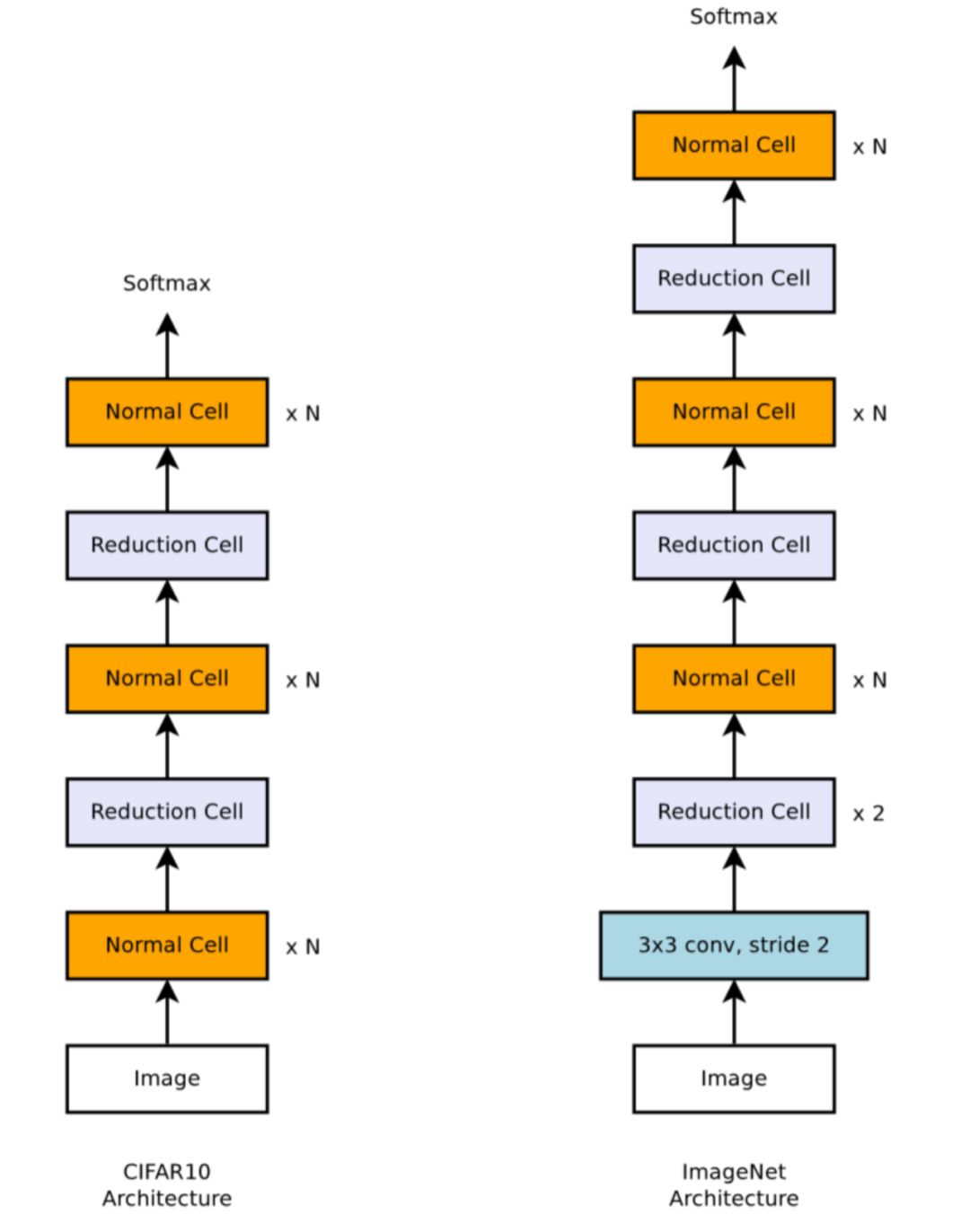 为了加快收敛速度,论文「Learning Transferable Architectures for Scalable Image Recognition」将网络拆分为多个 Normall Cell 和 Reduction Cell,只搜索这两个子模块中的拓扑结构,然后人工堆叠成最终的网络结构,如图 3 所示。