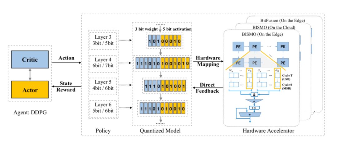 和剪枝类似,在参数量化方向,论文「HAQ: Hardware-Aware Automated Quantization」搜索出每层最优量化位宽已达到最佳的整体量化收益。整体框架和搜索剪枝的类似,如图 7 所示。