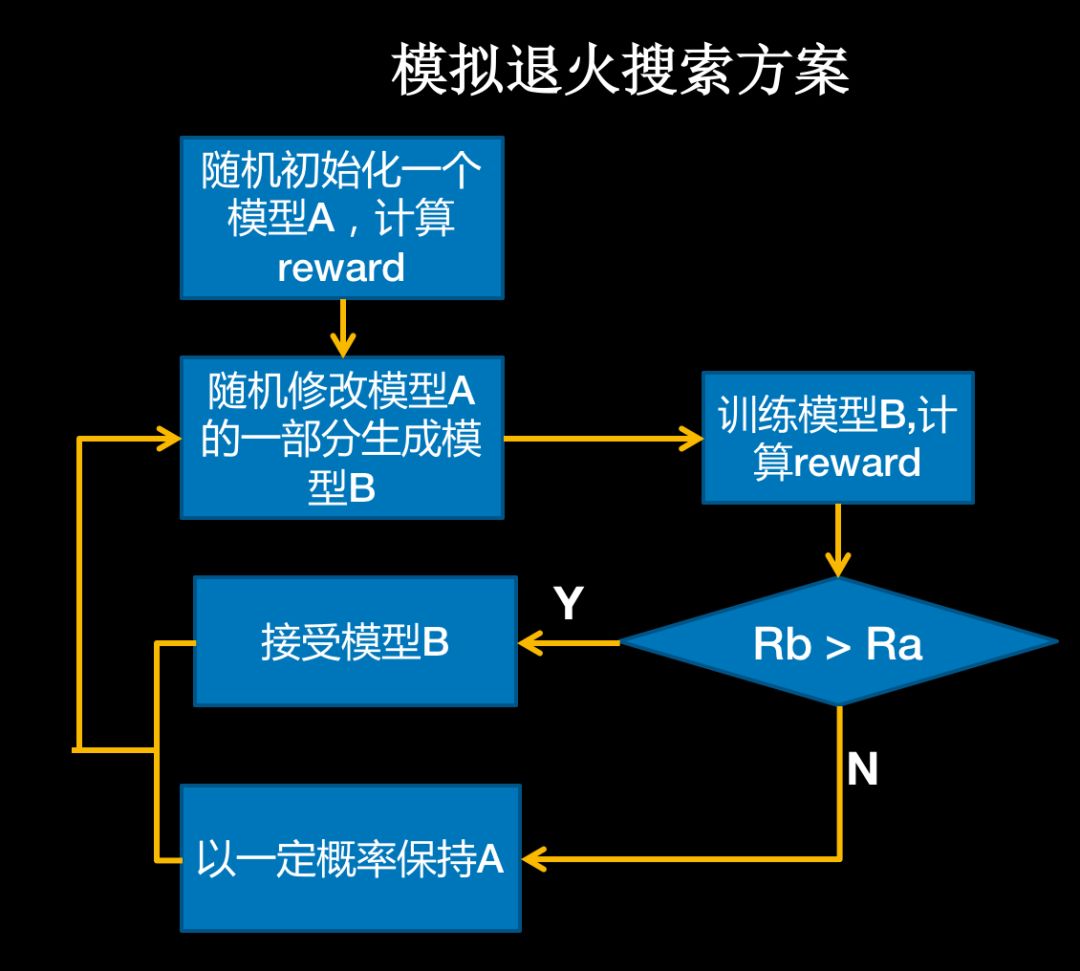 强化学习策略计算复杂度高、耗时长,因此 PaddleSlim 选用了经典的组合优化策略模拟退火。模拟退火算法来源于固体退火原理,将固体加温至充分高,再让其徐徐冷却,加温时,固体内部粒子随温升变为无序状,内能增大,而徐徐冷却时粒子渐趋有序,在每个温度都达到平衡态,最后在常温时达到基态,内能减为最小。鉴于物理中固体物质的退火过程与一般组合优化问题之间的相似性,我们将其用于网络结构的搜索。