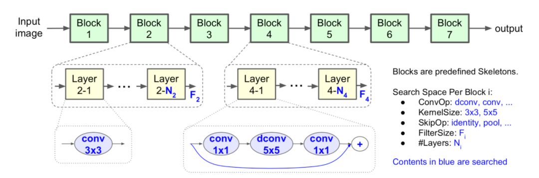 搜索空间定义了优化问题的变量,变量规模决定了搜索算法的难度和搜索时间。因此为了加快搜索速度,定义一个合理的搜索空间至关重要,早期的 NAS 因为没有限制搜索空间,甚至需要使用 800 块 GPU 训练一个月才能收敛。