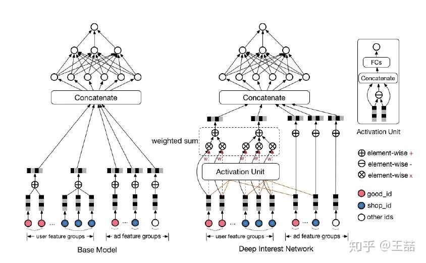 传统的 Attention 机制中,给定两个 item embedding,比如 u 和 v,通常是直接做点积 uv 或者 uWv,其中 W 是一个|u|x|v|的权重矩阵,但这篇 paper 中阿里显然做了更进一步的改进,着重看上图右上角的 activation unit,首先是把 u 和 v 以及 u v 的 element wise 差值向量合并起来作为输入,然后喂给全连接层,最后得出权重,这样的方法显然损失的信息更少。但如果你自己想方便的引入 attention 机制的话,不妨先从点积的方法做起尝试一下,因为这样连训练都不用训练。