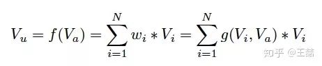 因为加入了注意力机制, V_u 从过去 V_i 的加和变成了 V_i 的加权和, V_i 的权重 w_i 就由 V_i 与 V_a 的关系决定,也就是上式中的 g(V_i,V_a) ,不负责任的说,这个 g(V_i,V_a) 的加入就是本文 70% 的价值所在。