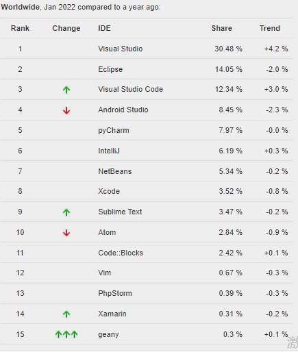 从以上数据我们可以看到自2011年1月至2022年1月,Eclipse的搜索下载频率大幅度降低,从51.54%降低至14.05%,这说明人们对于Eclipse的关注度在飞速降低。而相反的Visual Studio Code自从2015年发布以来搜索率飞速上涨。Visual Studio 也再缓慢稳步上升。