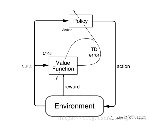 那么对应到RL中,Actor就是策略网络,来做动作选择(空间探索)。Critic就是值函数,对策略函数进行评估, 具体的流程如图: