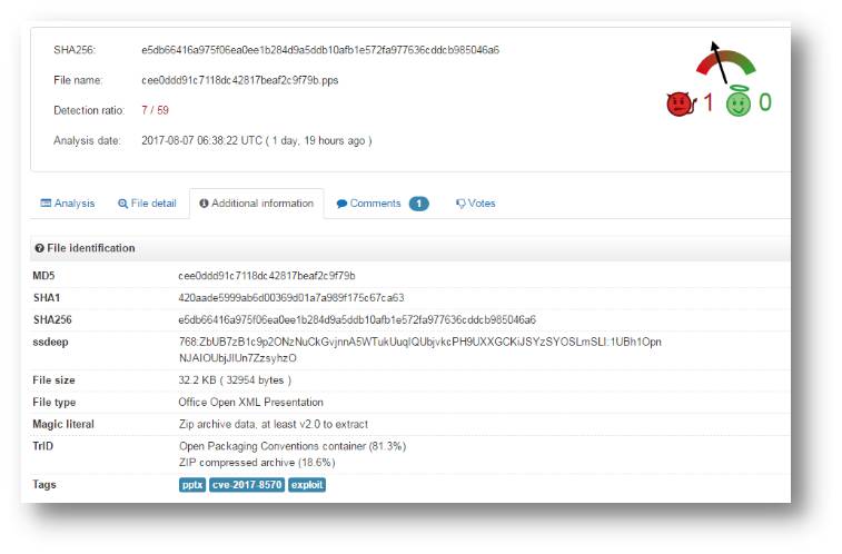 上周360天眼实验室发现了有国外黑客在Github上发布了CVE-2017-8570漏洞的利用代码,但随即删除,以此之后发现了不少标注为CVE-2017-8570的Office恶意样本,比如下面这个VirusTotal上被标记为CVE-2017-8570的样本。